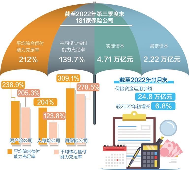 银保监会数据显示,截至2022年第三季度末,纳入偿付能力监管委员会工作会议审议的181家保险公司平均综合偿付能力充足率为212%,平均核心偿付能力充足率为139.7%;实际资本为4.71万亿元,最低资本为2.22万亿元。财产险公司、人身险公司、再保险公司的平均综合偿付能力充足率分别为238.9%、204%和309.1%;平均核心偿付能力充足率分别为205.3%、123.8%和278.5%。