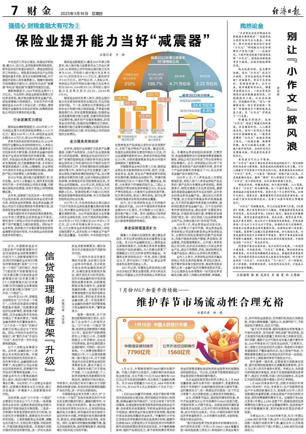最新数据显示,2022年保险业赔付1.5万亿元。与此同时,保险业积极发展第三支柱养老保险,稳步推出新型养老金融产品,保险保障能力持续提升。日前召开的中国银保监会2023年工作会议进一步提出,要持续提升金融服务实体经济质效,统筹推进保险公司回归本源和风险处置。
