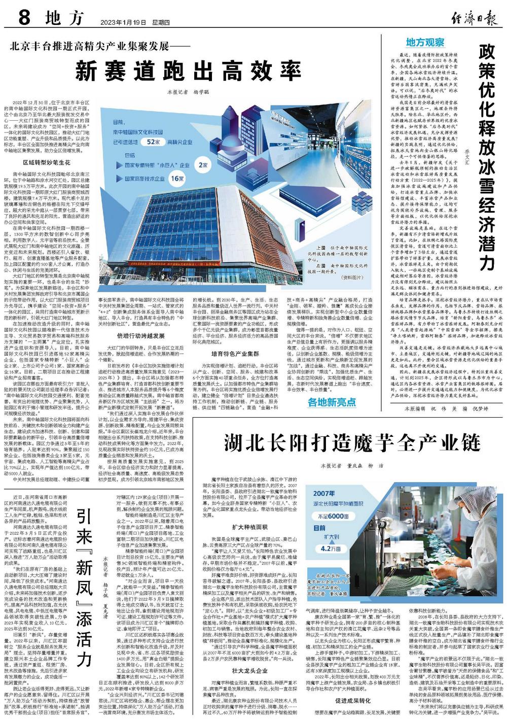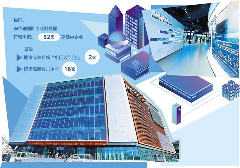 在加速推动改造升级的同时,南中轴国际文化科技园以瞄准新一代信息技术为主导、文化贸易数字贸易和高端科技服务为支撑的“一主两翼”产业定位,扎实推进产业组织和资源导入。目前,南中轴国际文化科技园已引进落地52家高精尖企业,包括国家专精特新“小巨人”企业2家、上市公司子公司1家、国家高新企业16家。目前,二期项目正在推动工程建设和产业招商蓄客。