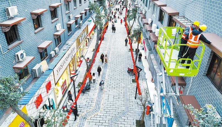1月18日,四川省眉山市小北街特色商业街西区改造项目正在进行收尾工作。该项目紧邻全国重点文物保护单位——三苏祠,将绿色可持续、历史文化传承、共建共治共享理念融入规划建设管理全过程,进一步提升城市内涵品质,改善居民居住条件,促进文化旅游融合发展。何晓波摄(中经视觉)