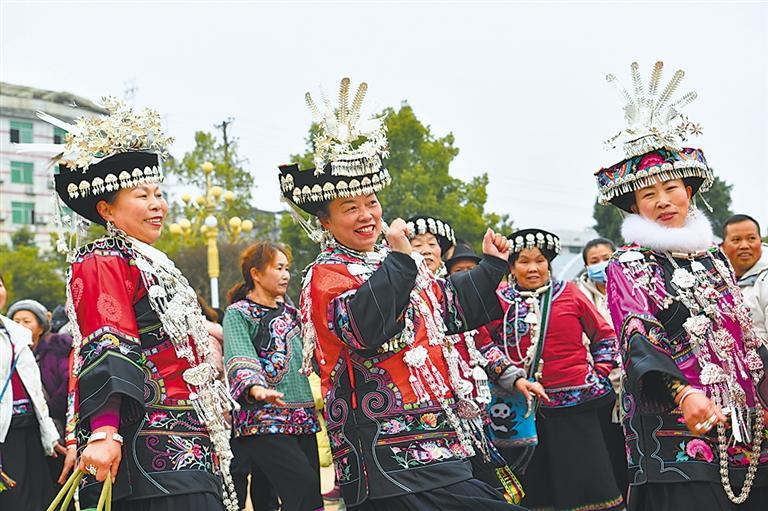 上图 1月22日,湖南省花垣县边城广场,苗族群众盛装参加活动。春节期间,当地开展多彩文化活动,吸引众多游客前来品味年俗文化。