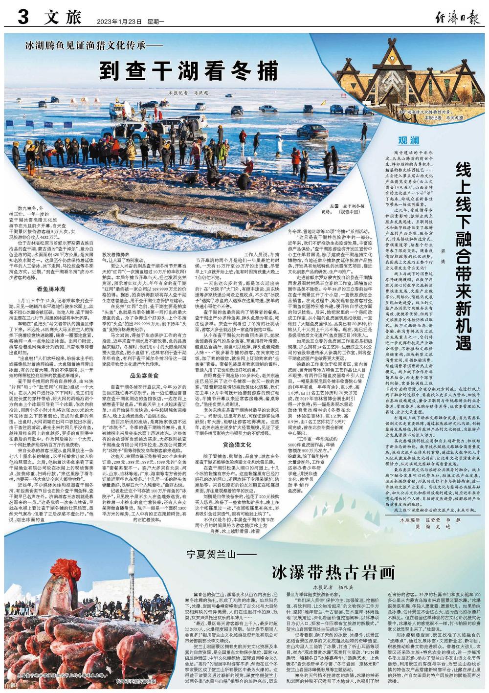 “这只是查干湖特色旅游中的一部分。近年来,我们不断推动生态旅游发展,丰富旅游产品供给。”查干湖旅游经济开发区宣传中心主任单君国说,除了建成查干湖渔猎文化博物馆,当地还借冬捕热度延伸旅游产品链条,开发具有地域特色的冰雪演艺项目,推进文化创意产品的研发、生产与推广。