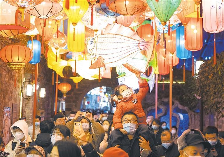 节日期间,各地举行丰富多彩的活动,年味儿十足。1月22日,江苏省南京市老门东景区花灯璀璨,吸引许多游人前来赏灯游玩,欢度春节。