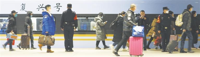 ▼1月21日,陕西省西安北站列车站台,西安北站派出所民警和客运工作人员值守在岗,护送旅客平安出行。