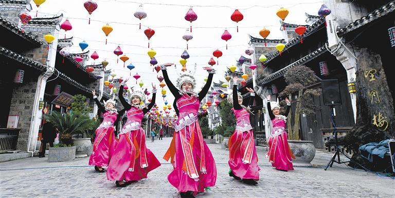 1月26日,演员在贵州省黔东南苗族侗族自治州黄平县旧州古镇表演节目。春节期间,贵州省各地景区纷纷举办民俗展演、花灯展示等活动,吸引了众多游客前来“打卡”。梁 文摄(中经视觉)