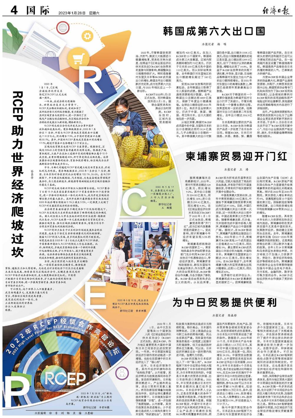 2022年1月1日,由中日及东盟等共15个国家加入的《区域全面经济伙伴关系协定》(RCEP)正式生效。通过RCEP,作为地区重要贸易大国的中国和日本之间首次达成自贸安排。一年来,中日两国发挥亚洲经济引领作用的动能进一步增强,也给处在困境中的日本经济注入了“强心剂”。