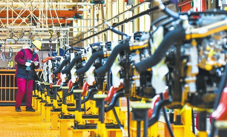 1月28日,山东省青州市,工人在江淮汽车山东分公司总装车间内组装生产。在春节假期结束后的第一个工作日,青州市各企业纷纷开工生产,全力拼经济促发展。王继林摄(中经视觉)