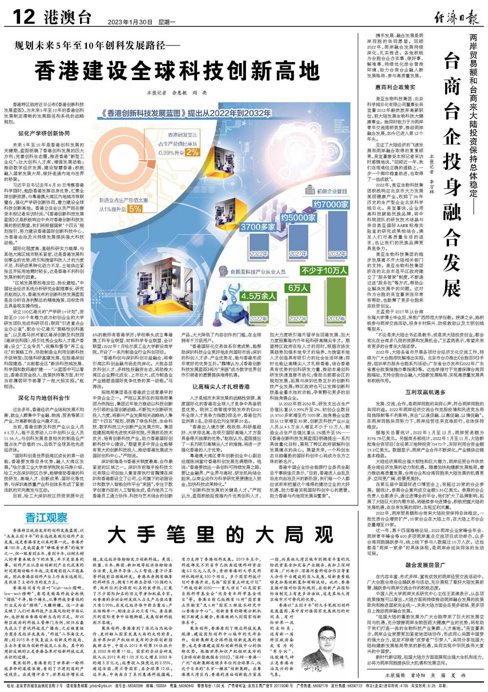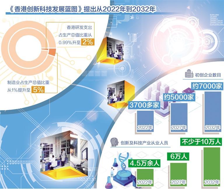 从2022年到2032年,研发支出占生产总值比重从0.99%升至2%、初创企业数目从3700多家增至约7000家、独角兽企业数目从12家增至30家,创新及科技产业从业人员从4.5万余人增至不少于10万人、制造业占生产总值比重从1%提升至5%……《香港创新科技发展蓝图》明确提出一系列具体量化目标,展现了特区政府破解科创发展痛点的决心。展望未来,一个科创生态日趋蓬勃的国际科创中心将成为东方之珠的新名片。