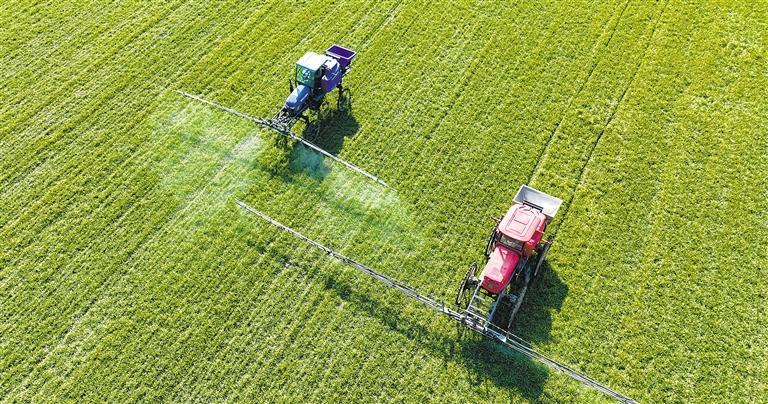 1月30日,安徽省亳州市利辛县纪王场乡和谐社区麦田,农民驾驶自走式高杆喷雾机对小麦进行喷药作业。新春伊始,亳州市各地农民抢抓农时,积极组织大型农业植保机械、植保无人机开展麦田作业,为夏粮丰收打下基础。