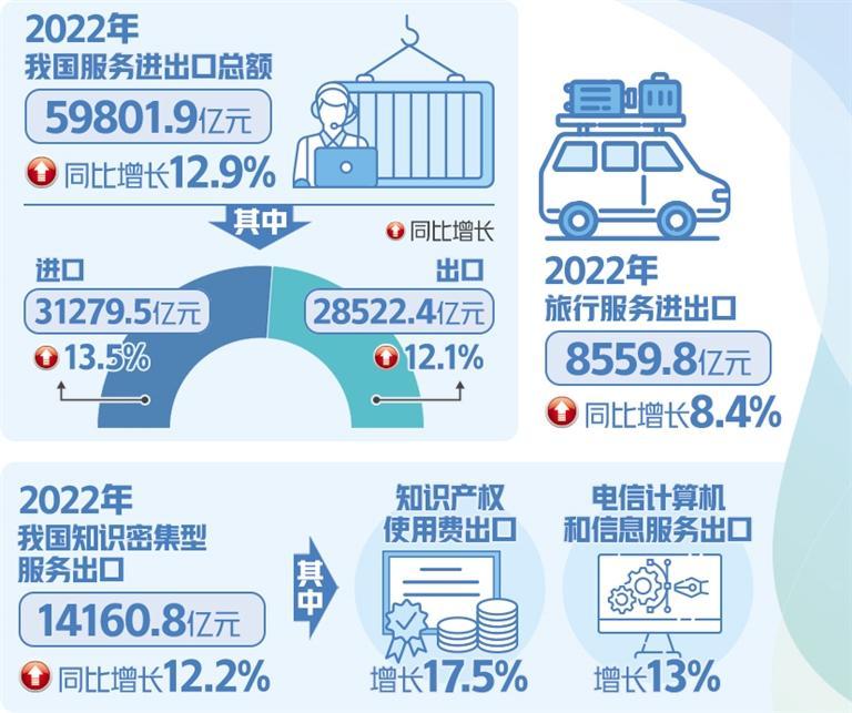 本报北京1月30日讯(记者冯其予)商务部发布的最新数据显示,2022年,我国服务贸易保持较快增长。全年服务进出口总额59801.9亿元,同比增长12.9%。其中服务出口28522.4亿元,增长12.1%;进口31279.5亿元,增长13.5%;逆差2757.1亿元。“中国服务”的国际竞争力进一步提升。