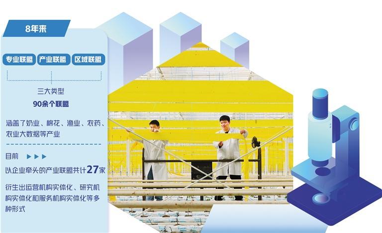 8年来,面向农业主要产业、典型区域和难点问题,建成专业联盟、产业联盟和区域联盟三大类型90余个联盟,涵盖了奶业、棉花、渔业、果业、油脂、农药、肥料、农机、农业大数据等产业,主导了盐碱地综合利用、东北秸秆焚烧、南方重金属污染、西南热区石漠化等重大问题的协同攻关。上千家科研院校、企业参与联盟建设,改变了各类科技创新主体单打独斗、各自为战的现状,基本形成了产学研用紧密结合、上中下游有机衔接的协同协作格局。