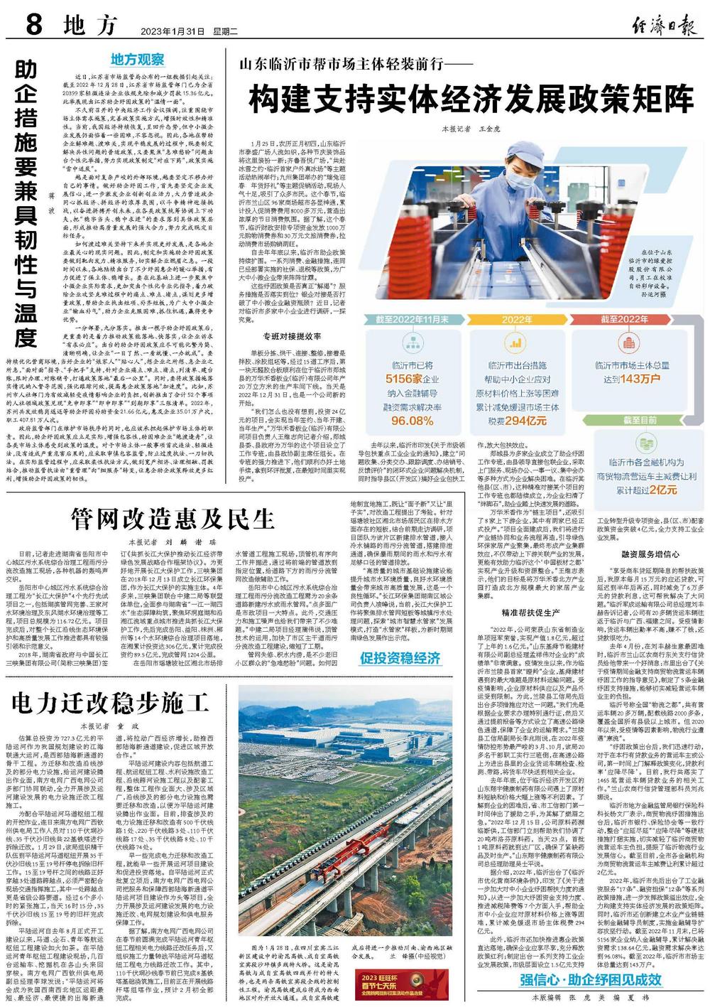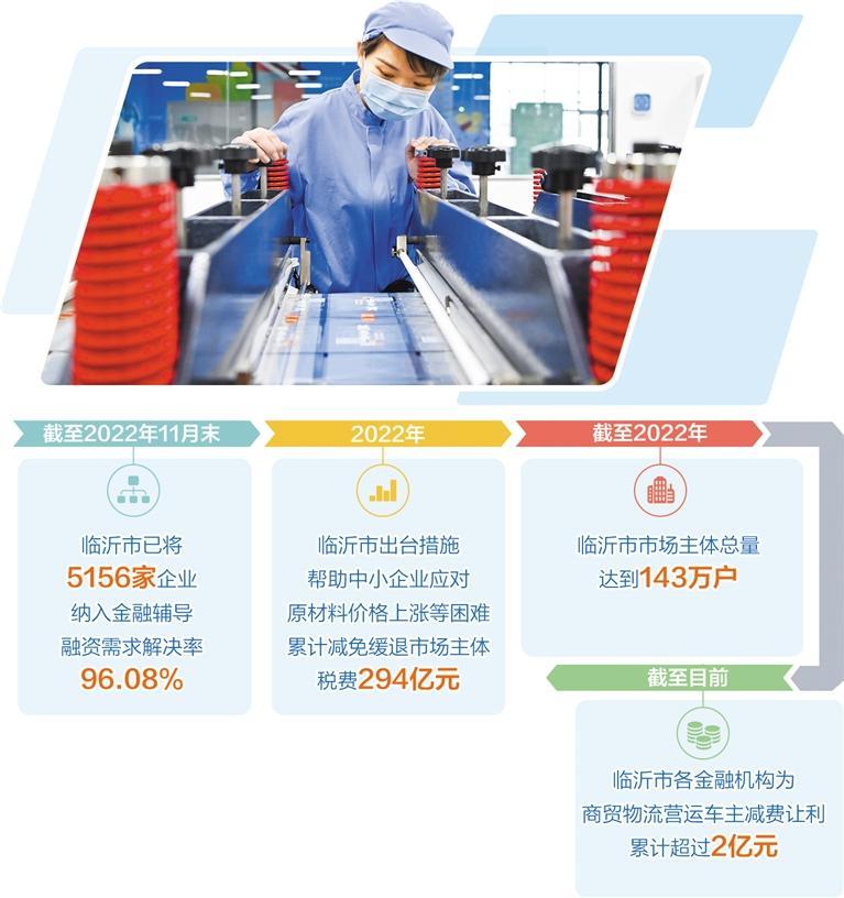 据介绍,2022年,临沂出台了《临沂市优化营商环境条例》,印发了《关于进一步加大对中小企业纾困帮扶力度的通知》,从进一步加大纾困资金支持力度、推进减税降费等7个方面入手,帮助全市中小企业应对原材料价格上涨等困难,累计减免缓退市场主体税费294亿元。