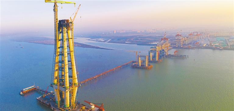 1月31日,江苏省泰州市,常泰长江大桥建设项目正在紧张施工。春节假期过后,中交二航局建设者铆足干劲,严格把控施工节点计划,高标准推进大桥项目建设。汤德宏摄(中经视觉)