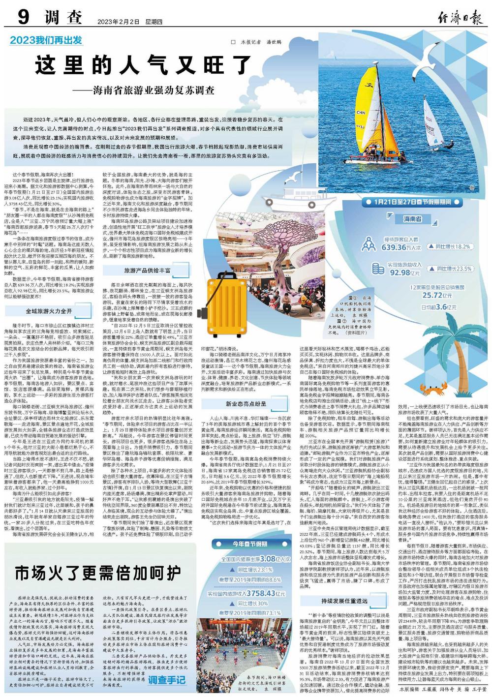 人山人海、川流不息、华灯璀璨……当沉寂了3年的滨海旅游城市遇上解封后的首个春节黄金周,海南旅游经济瞬间激活。离岛免税购物异军突起,亮点纷呈。海上旅游、低空飞行、游艇出海等新业态,发展势头迅猛,海南探索以体育赛事+文化活动+旅游节庆为一体的文体旅产业融合发展新模式。