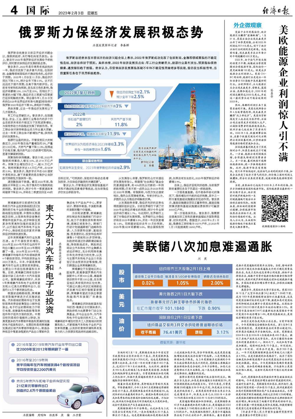 俄罗斯总统普京在日前召开的经济问题会议上表示,2022年俄罗斯成功克服了包括财政、金融等领域面临的不确定性危机,经济总体好于预测。具体来看,2022年经济发展亮点有:军工行业贡献巨大、能源行业盈利突出、预算指标保持健康、通货膨胀趋于放缓。普京认为,尽管俄经济发展面临基础不牢和不确定性因素增多等挑战,但仍发出积极信号,当前重要任务在于巩固积极趋势。