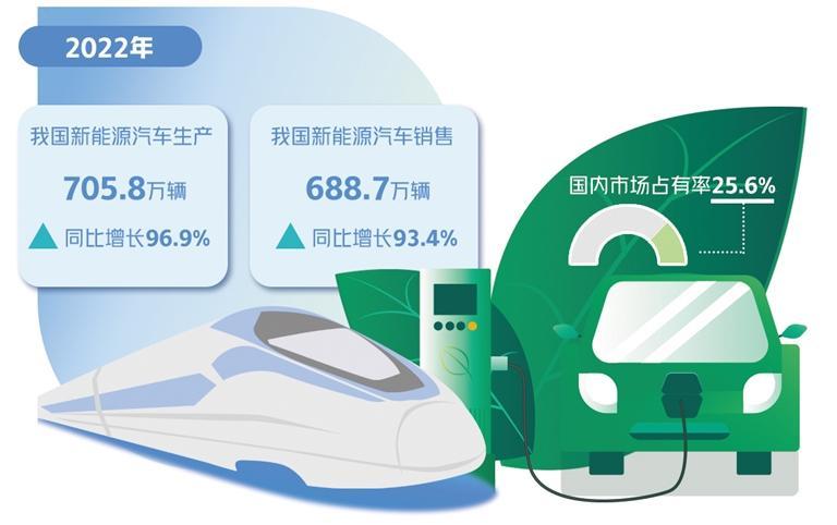 汽车产业是国民经济的重要支柱产业,在国民经济和社会发展中发挥着重要作用。发展新能源汽车是我国从汽车大国迈向汽车强国的必由之路,也是应对气候变化、推动绿色发展的战略举措。2022年,我国新能源汽车产销量分别达到705.8万辆和688.7万辆,同比分别增长96.9%和93.4%,国内市场占有率达到25.6%。