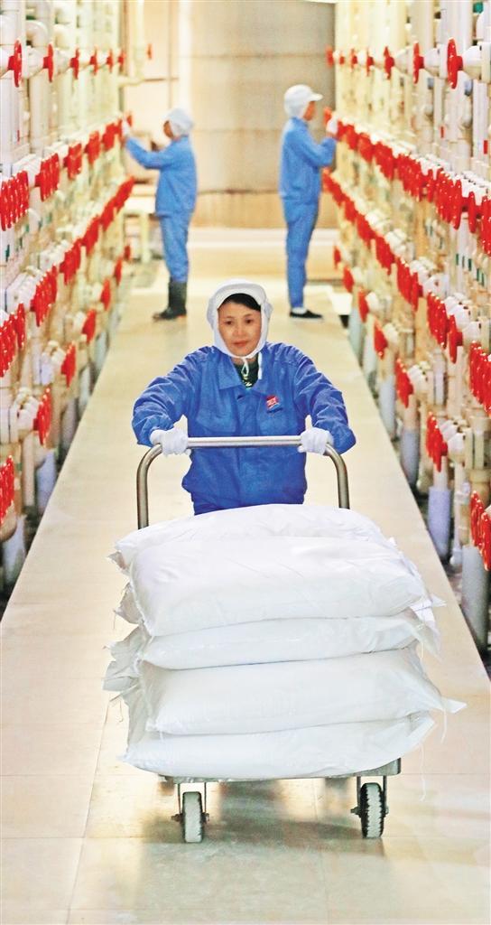 ▼2月1日,位于江西省丰城市尚庄街道的江西恒顶食品有限公司,员工在运送原料,加紧生产。王 堃摄(中经视觉)