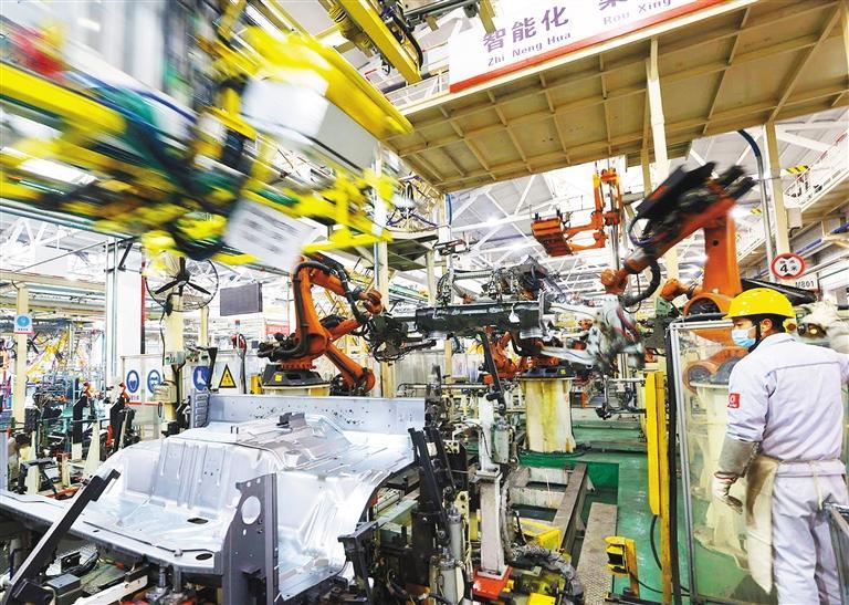 ◀2月1日,东风汽车股份有限公司襄阳工厂轻卡焊装线上,42台机器人有序抓取、焊接、落放,3分钟1台车身,日可完成300辆份生产。