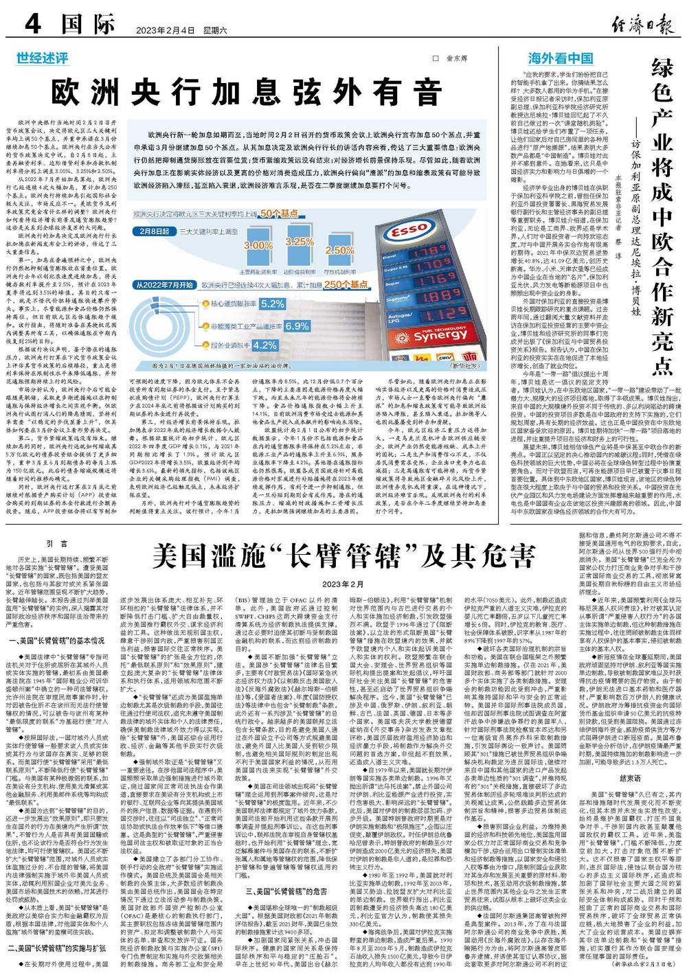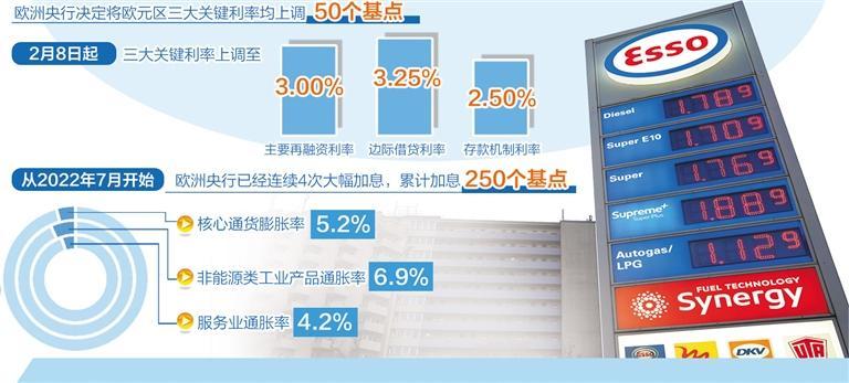 欧洲中央银行当地时间2月2日召开货币政策会议,决定将欧元区三大关键利率均上调50个基点,并重申承诺在3月份继续加息50个基点。欧洲央行在当天公布的货币政策决定中说,自2月8日起,主要再融资利率、边际借贷利率和存款机制利率将分别上调至3.00%、3.25%和2.50%。