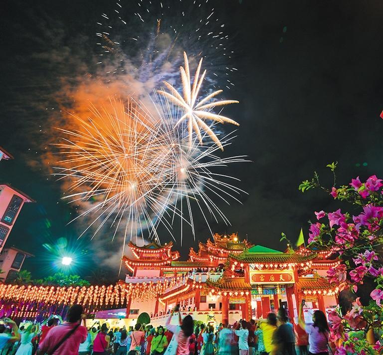 ▼1月22日零时许,马来西亚吉隆坡的天后宫燃放烟花,喜迎新春。张纹综摄
