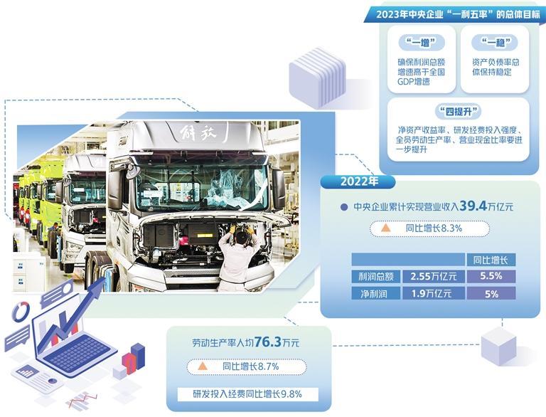 2023年中央企业“一利五率”的总体目标是“一增一稳四提升”。“一增”就是要确保利润总额增速高于全国GDP增速。“一稳”就是资产负债率总体保持稳定。“四提升”就是净资产收益率、研发经费投入强度、全员劳动生产率、营业现金比率4个指标要进一步提升。