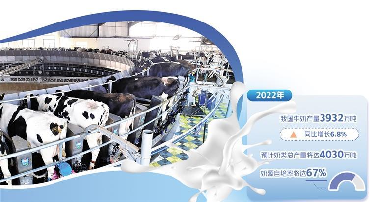 根据国家统计局数据,2022年我国牛奶产量3932万吨,同比增长6.8%。按此增幅和2021年全年奶类总产量,2022年奶类总产量预计将达到4030万吨,首次超过4000万吨。同时,按表观消费量计算的我国奶源自给率将实现自2016年以来的首次回升,达到67%。但是,由于乳制品需求下降和饲料价格攀升,2022年中国奶牛养殖业也面临价格下行与成本上涨双向挤压的突出困难。