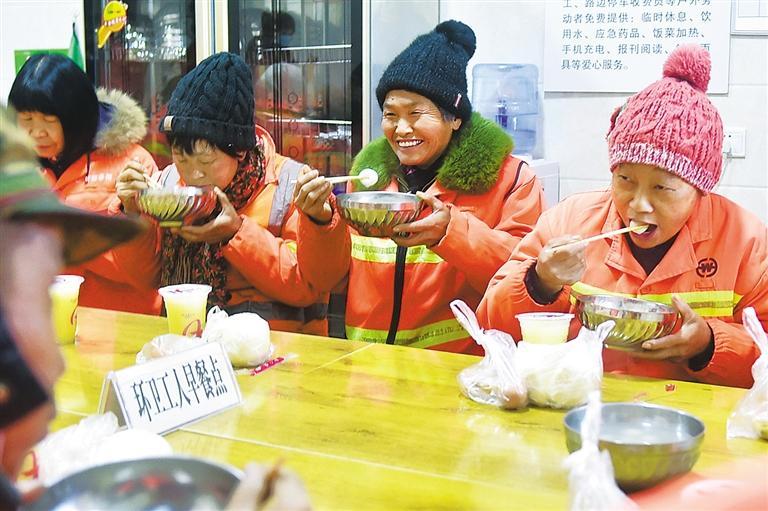 ◀2月5日,河南省洛阳市涧西区浅井西路环卫爱心驿站,环卫工人吃着热气腾腾的“爱心元宵”。