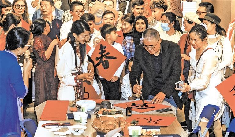▼2月4日,来自俄罗斯、格鲁吉亚、爱尔兰、阿富汗等国家的40多位国际友人欢聚到海南省海口市骑楼老街,写书法、弹古筝、学琼剧、品汤圆、欣赏才艺表演,感受中华传统文化魅力。蒋聚荣摄(中经视觉)