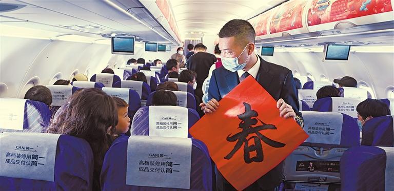 ▼2月4日,在大连飞往广州的CZ6321航班上,乘客们以“春”字为题玩“飞花令”。