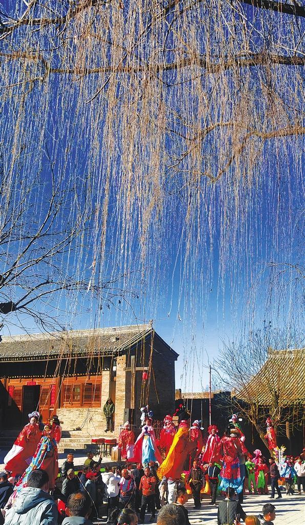 ◀2月4日,山西省晋中市张壁古堡村农民在街头扭秧歌、踩高跷。