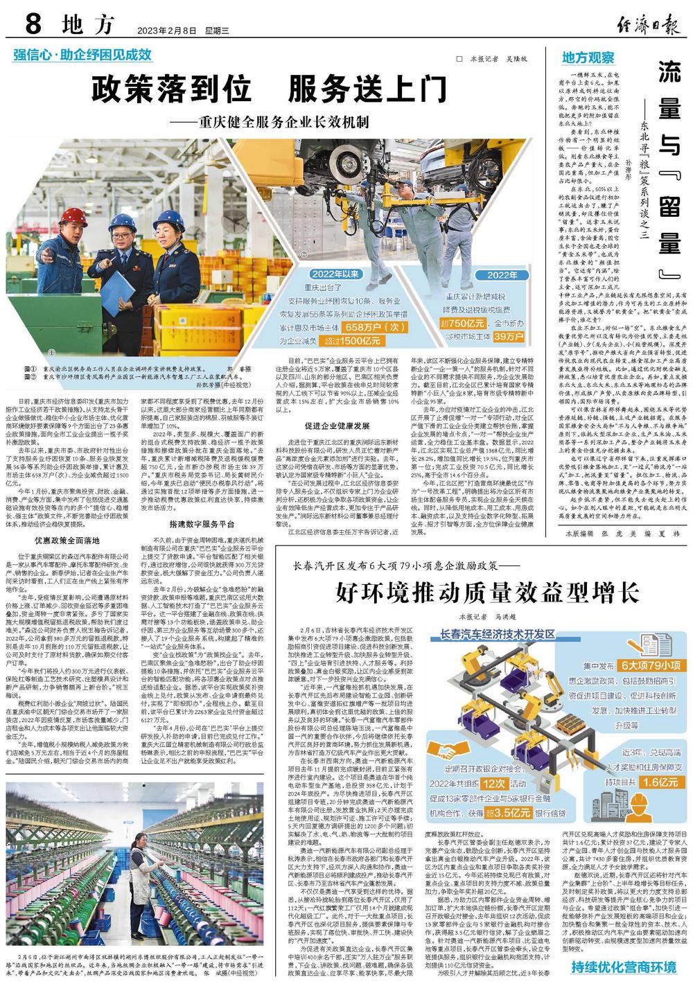 2月6日,吉林省长春汽车经济技术开发区集中发布6大项79小项惠企激励政策,包括鼓励招商引资促进项目建设、促进科技创新发展、加快推进工业转型升级、加快服务业转型升级、“四上”企业培育引进扶持、人才服务等。利好政策叠加、真金白银奖励,让区内企业感受到浓浓暖意,对下一步投资兴业充满信心。
