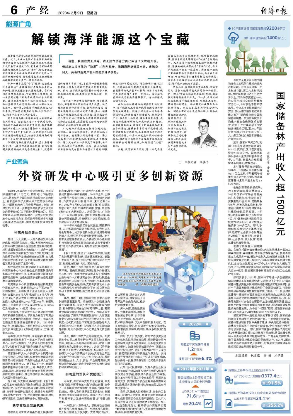 广义的海洋能源还包括海上的风能、太阳能、海上油气资源等,这些在陆地上同样存在。我国海上风能资源丰富,海上风电累计和新增装机容量均位居全球首位,海上风电产业初步形成了环渤海、长三角、珠三角等产业集群。未来,海上风能在沿海省份的发电量占比有望从目前的2%提升至2050年的近20%。海上油气方面,2022年,全球海洋油气勘探开发投资大幅增长,我国海洋油气产量再创新高,海洋石油贡献了全国石油增产量的一半以上。海洋油气资源将成为重要资源接替区,有力保障我国油气安全。