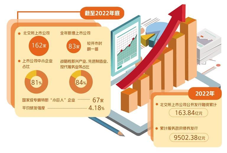 截至2022年末,北交所上市公司162家,全年新增上市公司83家,较开市时翻一番;上市公司中小企业占比81%,战略性新兴产业、先进制造业、现代服务业等企业占比84%,国家级专精特新“小巨人”企业67家,平均研发强度达4.18%,部分公司突破“卡脖子”技术,实现进口替代或拥有国际领先的技术专利。2022年前三季度,北交所上市公司营业收入和净利润分别同比增长28.60%、14.38%,展现了发展活力与韧性。