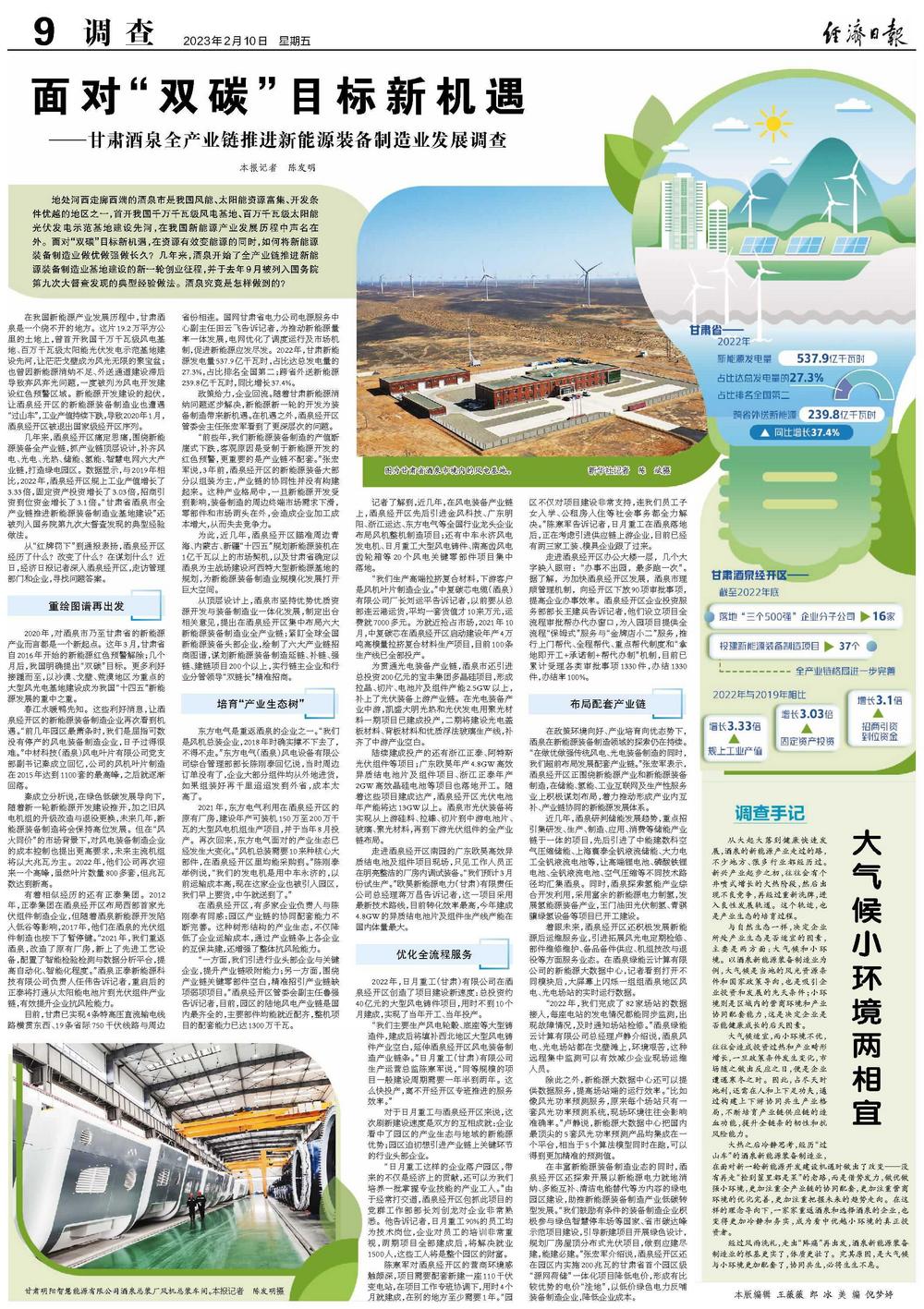地处河西走廊西端的酒泉市是我国风能、太阳能资源富集、开发条件优越的地区之一,首开我国千万千瓦级风电基地、百万千瓦级太阳能光伏发电示范基地建设先河,在我国新能源产业发展历程中声名在外。面对“双碳”目标新机遇,在资源有效变能源的同时,如何将新能源装备制造业做优做强做长久?几年来,酒泉开始了全产业链推进新能源装备制造业基地建设的新一轮创业征程,并于去年9月被列入国务院第九次大督查发现的典型经验做法。酒泉究竟是怎样做到的?
