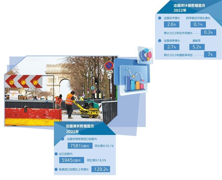 法国经济学界认为,经济数据喜忧参半,特别提醒需高度警惕其中蕴藏的风险雷区,呼吁“不要因良好的数据表象而忽视其中的危险迹象”。具体而言,一是消费低迷。在高通胀背景下,法国家庭消费急剧下降,该领域一直是法国经济增长的传统引擎,但在去年四季度的传统购物旺季,法国家庭商品和服务消费反而下降0.9%,全年消费仅增长2.7%,约为2021年的一半。二是通胀高企。2022年法国全年通胀率达5.2%,持续处于历史高位,使法国实际工资收入有所下降,虽然在政府相应补贴下有所缓解,但企业面对攀升的生产成本,正不断将负担转嫁至消费者,进而引发恶性循环。据统计,2022年四季度法国消费者价格指数(CPI)同比上涨近6%,其中能源和食品价格增长明显,涉及民生食品领域的意大利面、肉类和鸡蛋等价格涨幅突出。据预测,2023年,法国通胀或将继续加速,并达到7%左右的峰值。三是企业困境。法国央行在近期发布的报告中用“走钢丝”来形容法国企业2023年将面临的形势,警告企业的现金流、企业间支付及企业偿还银行贷款、社会债务等将面临巨大的不确定性,并指出受现金周转不当、还贷违约等影响,2022年企业破产率急剧上升。同时,受供应乏力、招聘困难、物价上涨等影响,接受国家担保贷款企业进行债务重组的案例也在不断激增,其中尤以建筑业最为严峻,也使公共财政遭受巨大损失。