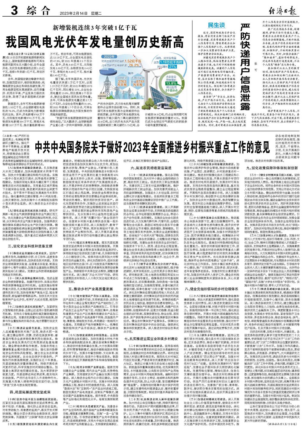 本报北京2月13日讯(记者王轶辰)在13日召开的国家能源局新闻发布会上,国家能源局新能源和可再生能源司副司长王大鹏介绍,去年全国风电、光伏发电新增装机达到1.25亿千瓦,连续3年突破1亿千瓦,再创历史新高。