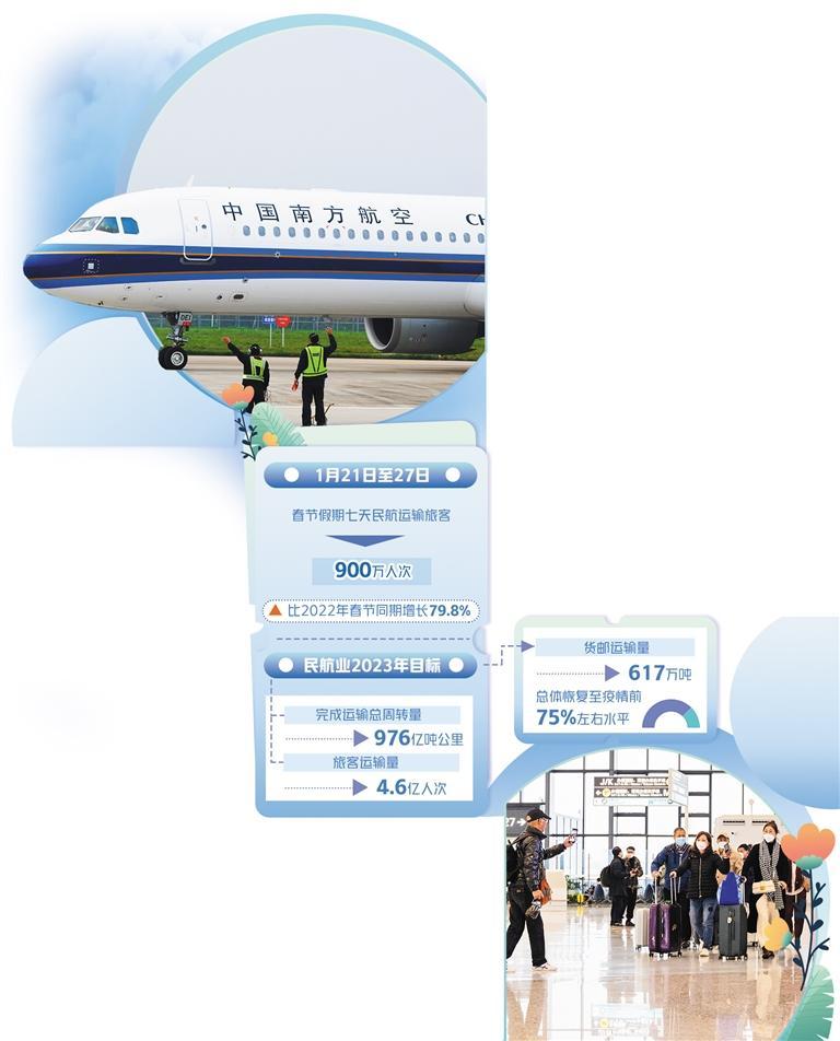 民航业2023年的目标是完成运输总周转量976亿吨公里,旅客运输量4.6亿人次,货邮运输量617万吨,总体恢复至疫情前75%左右水平,实现盈亏平衡。为此,要在国际航班航线上不断加力,在拓展国内客运货运网络上不断挖潜,在智慧绿色高质量发展中精准发力。