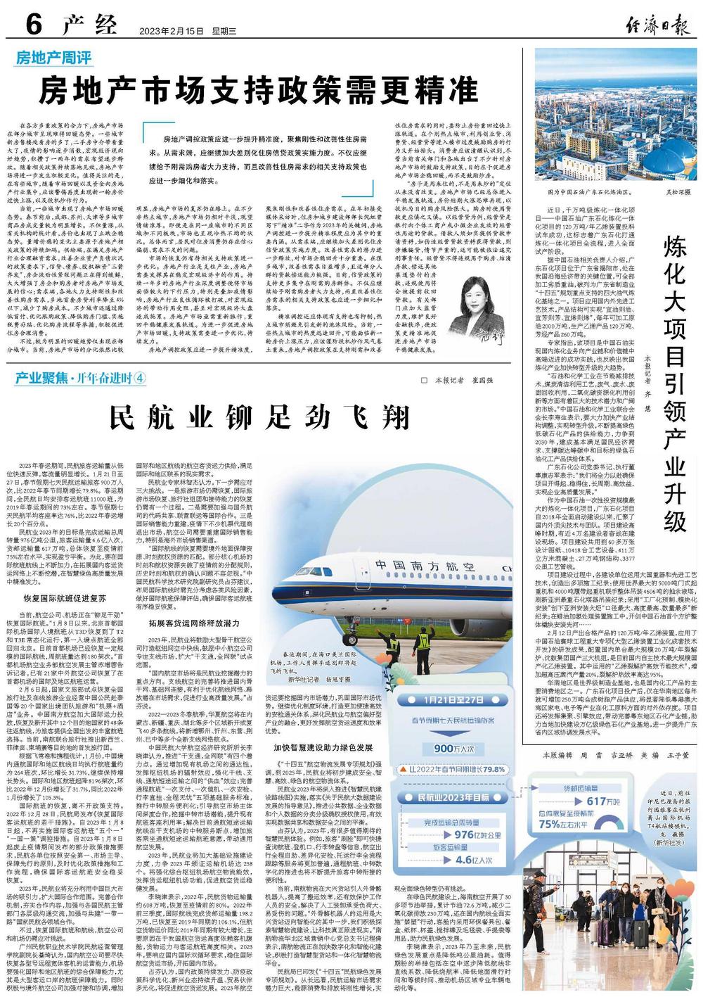 “国内航空市场将是民航业挖掘潜力的重点方向。支线航空的完善将推进国内骨干网、基础网连接,有利于优化航线网络、释放潜在市场需求,促进行业高质量发展。”占芬说。