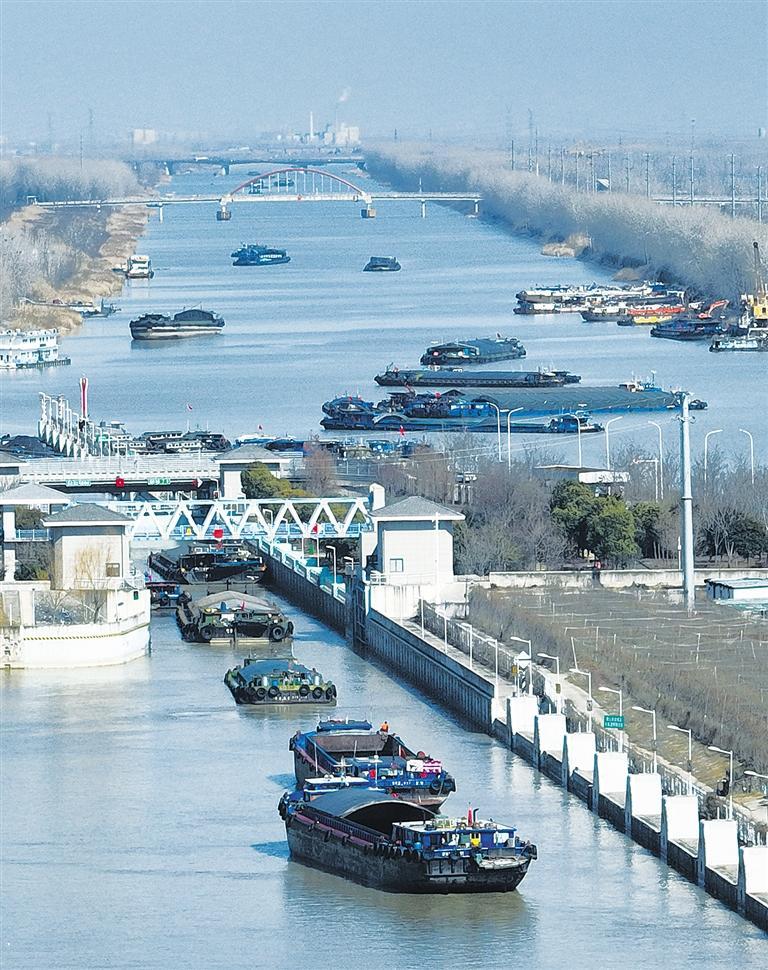 二月十五日,江苏省淮安市洪泽区高良涧船闸,运输船舶等待过闸。连日来,企业陆续开工,在洪泽区苏北灌溉总渠河道内,水上运输迎来了繁忙期,货运船舶穿梭往来。殷 潮摄(中经视觉)