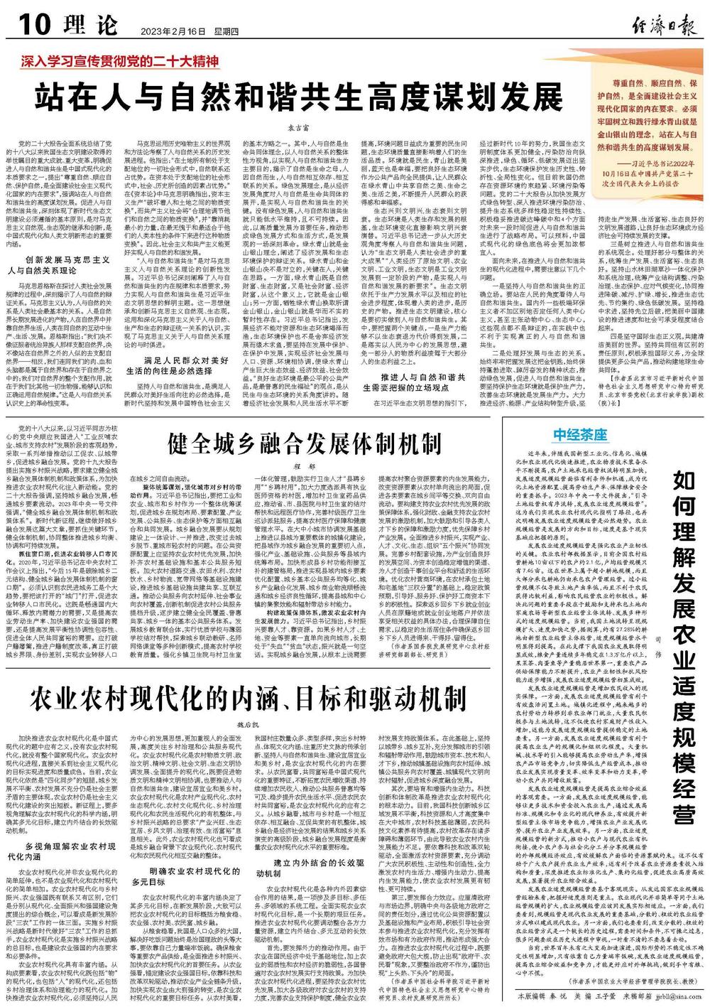 党的十八大以来,以习近平同志为核心的党中央顺应我国进入“工业反哺农业、城市支持农村”发展阶段的客观趋势,采取一系列举措推动以工促农、以城带乡,促进城乡融合发展。党的十九大报告提出实施乡村振兴战略,要求建立健全城乡融合发展体制机制和政策体系,为加快推进农业农村现代化注入新动能。党的二十大报告强调,坚持城乡融合发展,畅通城乡要素流动。2023年中央一号文件强调,“健全城乡融合发展体制机制和政策体系”。新时代新征程,继续做好城乡融合发展这篇大文章,要抓住关键环节,健全体制机制,协同整体推进城乡均衡、协调和可持续发展。