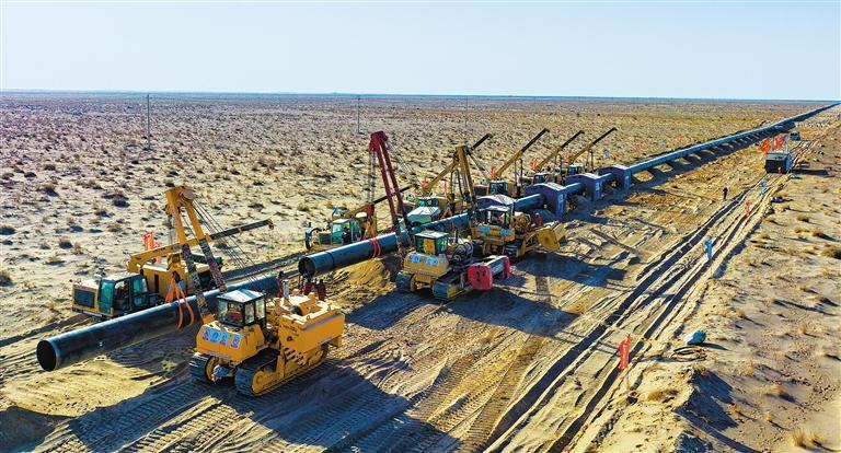 2月15日,在西气东输四线管道工程新疆哈密段,工作人员在沙漠中施工。连日来,新疆哈密各重点建设项目陆续开工,在国家重点工程——西气东输四线管道工程建设现场,建设单位通过配置优势资源、合理分配机械设备等举措,已实现全线复工。该工程预计2024年全线具备投产条件,届时西气东输管道系统年输送能力可达千亿立方米。