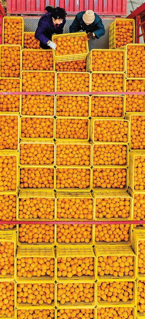 ▲2月15日,湖北省宜昌市香溪村脐橙园,果农将采摘的脐橙装车。宜昌市大力扶持农民发展特色水果产业,做到一年四季有新鲜水果上市。郑家裕摄(中经视觉)