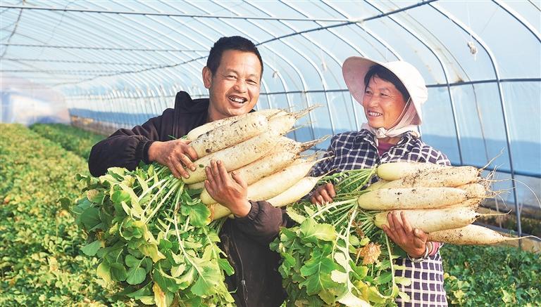 ▶2月15日,云南省丽江市古城区金山街道金山社区蔬菜大棚,菜农在采收萝卜,及时充实市民餐桌。