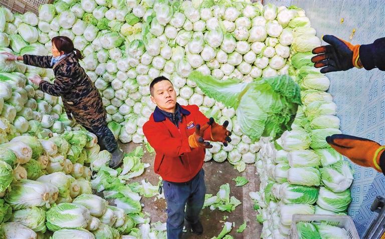 ▼2月17日,山东省日照市高新区新发地农副产品批发市场,商户在搬运白菜。该市场日均蔬菜水果交易量达360吨左右,供销两旺。朱元理摄(中经视觉)