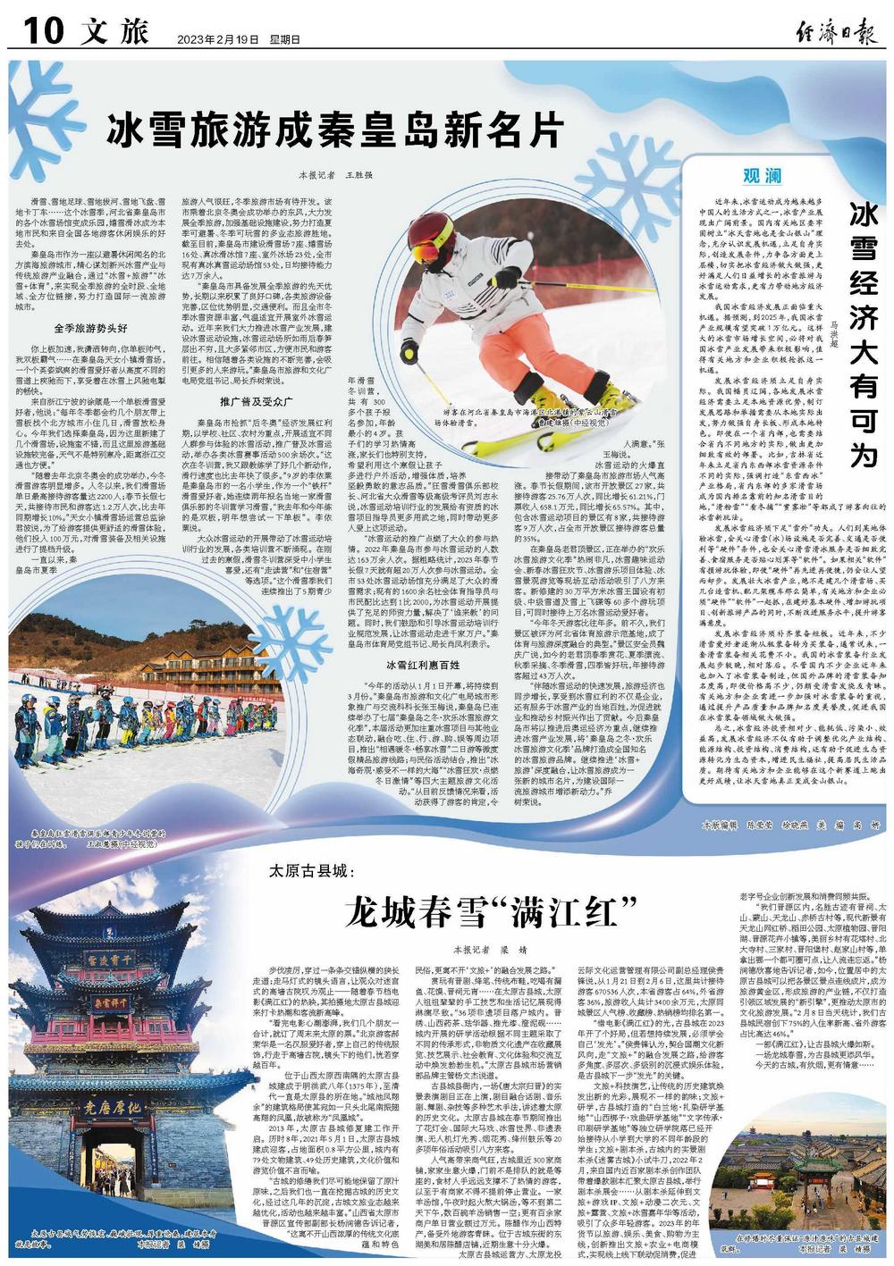 “秦皇岛市具备发展全季旅游的先天优势,长期以来积累了良好口碑,各类旅游设备完善,区位优势明显,交通便利。而且全市冬季冰雪资源丰富,气温适宜开展室外冰雪运动。近年来我们大力推进冰雪产业发展,建设冰雪运动设施,冰雪运动场所如雨后春笋层出不穷,且大多紧邻市区,方便市民和游客前往。相信随着各类设施的不断完善,会吸引更多的人来游玩。”秦皇岛市旅游和文化广电局党组书记、局长乔树荣说。