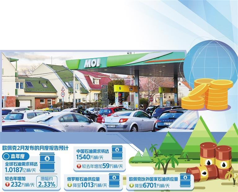 石油输出国组织(欧佩克)2月发布的月度报告提高了对石油需求增长的预期,称本年度全球石油需求预计将达到1.0187亿桶/天,较去年增加232万桶/天,增幅约2.33%,较上月的预测数据高出10万桶/天,这也是欧佩克自去年9月以来首次上调该预期。