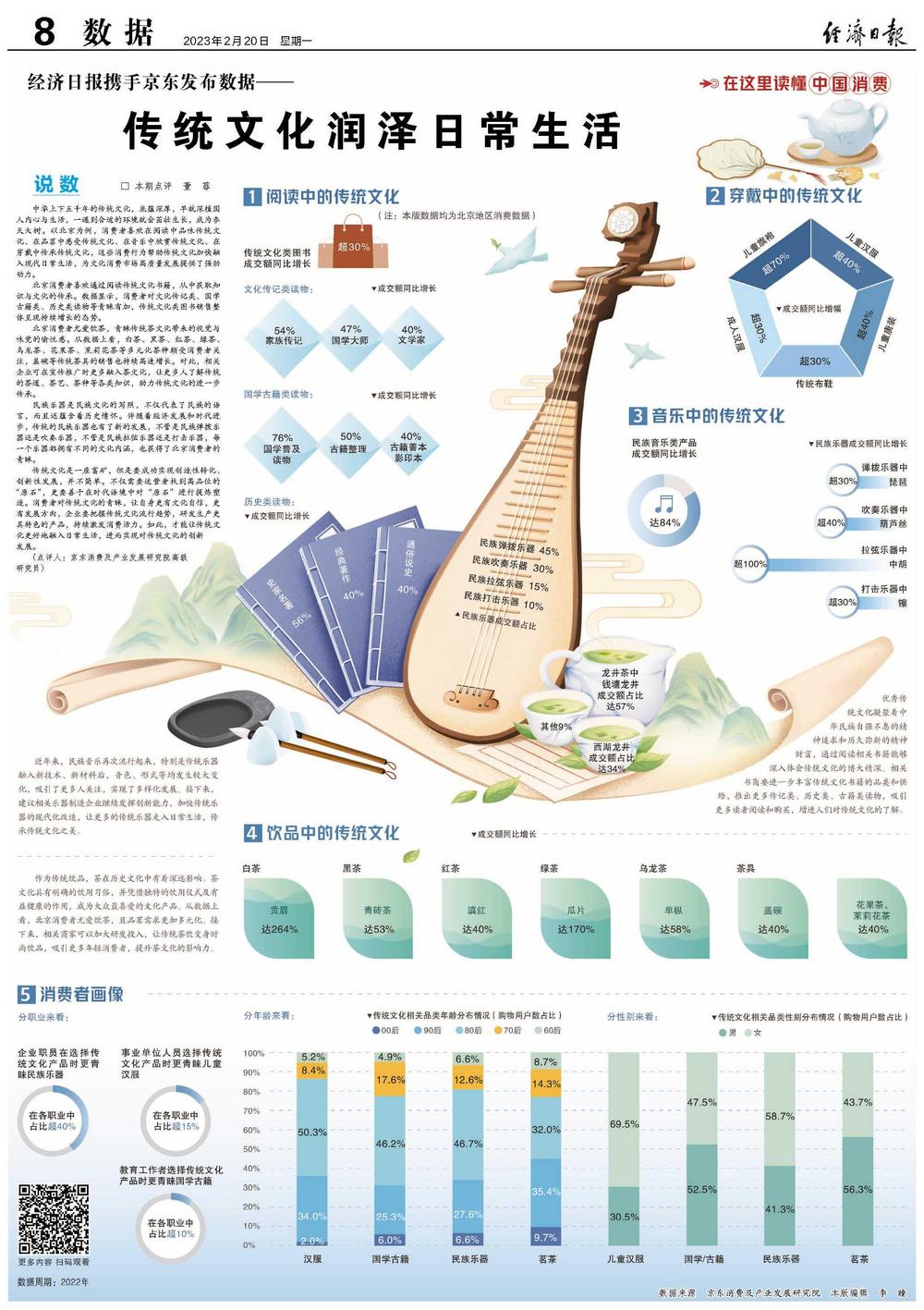 中华上下五千年的传统文化,底蕴深厚,早就深植国人内心与生活,一遇到合适的环境就会茁壮生长,成为参天大树。以北京为例,消费者喜欢在阅读中品味传统文化、在品茗中感受传统文化、在音乐中欣赏传统文化、在穿戴中传承传统文化,这些消费行为帮助传统文化加快融入现代日常生活,为文化消费市场高质量发展提供了强劲动力。