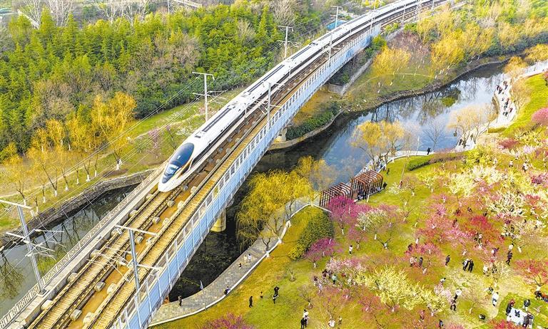 2月19日,高铁列车从安徽省合肥市政务区匡河岸边的梅林花海驶过。早春时节,随着气温回暖,合肥匡河沿线的梅花陆续开放,吸引众多市民和游客前来拍照打卡。左学长摄(中经视觉)