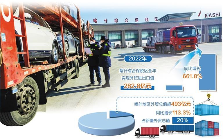 数据显示,2022年,喀什综合保税区全年实现外贸进出口值282.8亿元,同比增长661.8%,进出口值和增速均位居新疆4个综保区之首。