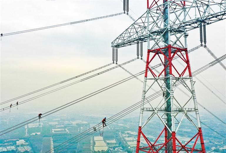 2月20日,在385米世界最高输电铁塔——江苏凤城至梅里500千伏输电线路工程长江大跨越现场,施工人员正在百米高空进行走线验收。该工程建成投运后,可满足约800万户家庭的日常用电需求。史 俊摄(中经视觉)